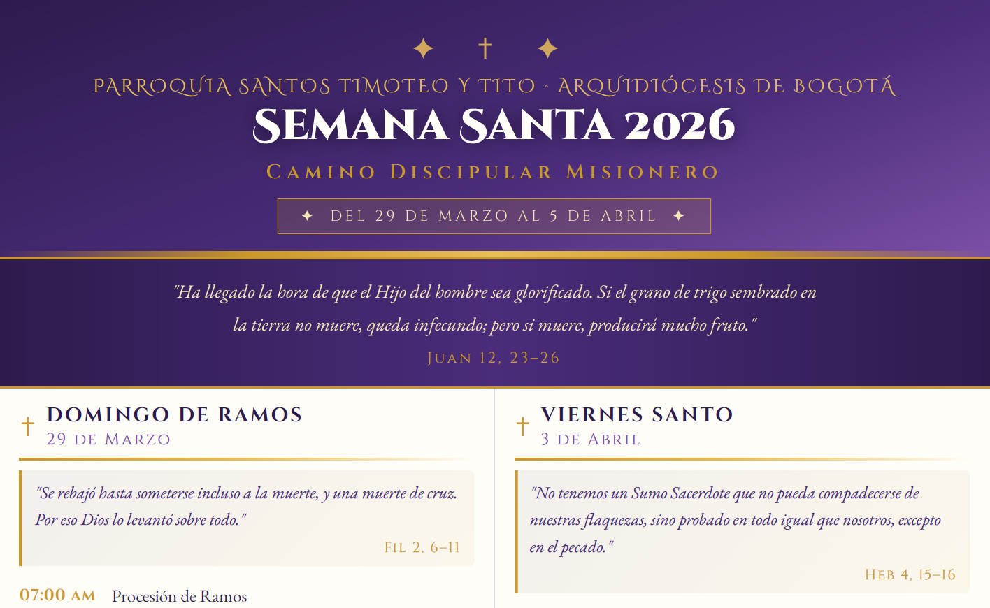 BoletinesPrograma Semana Santa 2026 - 29 de marzo al 5 de abril18 de Marzo de 2026Compartimos a toda la comunidad parroquial el programa para la Celebración de la Semana Santa de este 2026. Los invitamos a participar activamente en familia con mucha fe Descargue el boletín aquí Like 0 Dislike 0